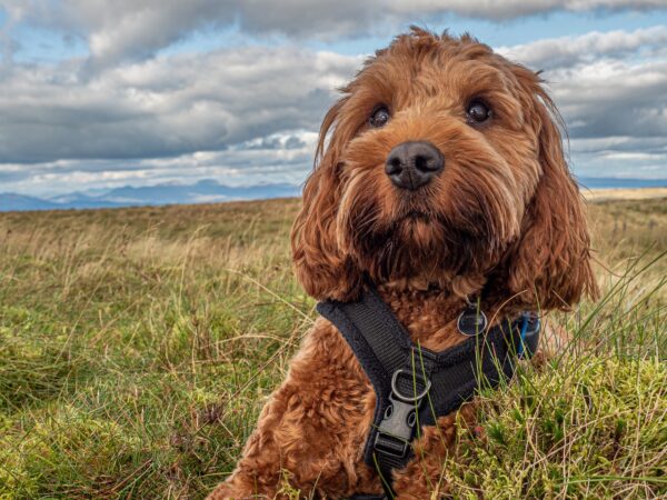 A young red cockapoo sitting in a field on Holehead in the Campsie Fells, Scotland